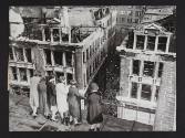 Women on a roof looking at badly damaged buildings in London.