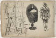 Library, lamp, figure dressed in fur
