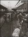 A burnt out car lies on railway tracks at a station, Battipaglia, 1969