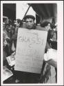 A man hands out protest papers and holds a placard with a message against cutting child benefits