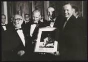 The astronauts from Apollo 11, Neil Armstrong, Michael Collins and Buzz Aldrin being presented with a framed photo of their landing on the moon