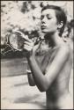 The actress Sonia Ciuffi sits topless and brushes her hair in a mirror