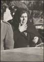 A survivor of the Belice earthquake wears a black shawl and carries a basket on a street between to policemen, Sicily, 1968