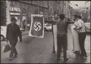 Men holding a Swastika flag in a protest against the pope during the divorce law referendum, Rome