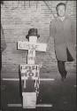 A man standing by a hand-made coffin, painted with slogans highlighting the plight of poverty and homelessness