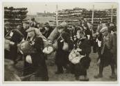 Deportation group with belongings passing piles of wood