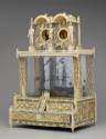 Mediumcase: bone, some painted; gold leaf, probably on paper; straw marquetry, stained; hand-tinted prints; watercolour on laid paper; glass; mirror. ship: wood, painted and varnished; paper, painted and varnished; cotton/linen line; copper alloy; painted paper-covered base