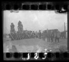 Group of workers with agricultural tools supervised by a Jewish policeman